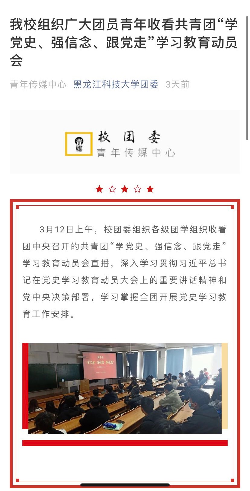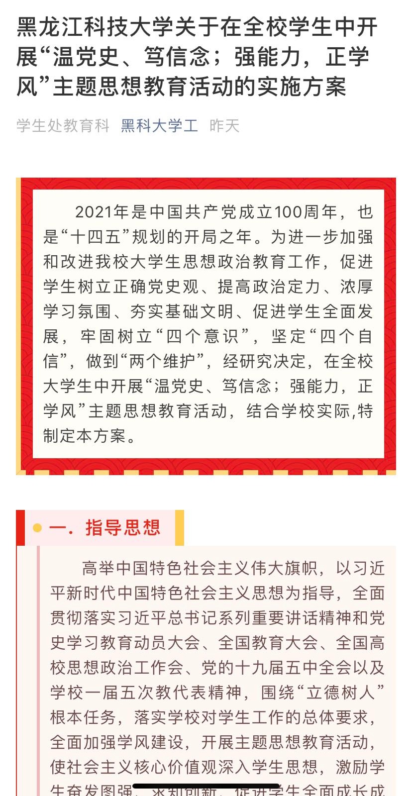 六是以多种形式开展“四史”学习教育。认真学习贯彻习近平总书记关于开展“四史”学习教育的重要指示精神,切实抓好“四史”学习教育。各单位组织师生关注“龙江高校网络思政中心”官方微博,观看“四史学习教育·微领学”网络直播课堂,并广泛开展了以学习“四史”为主题的讨论与交流。如,马克思主义学院在微信公众平台开展“四史”学习教育成果征集展示活动。各学院根据实际情况组织开展党支部竞答评比、宿舍打擂、班级打擂等不同层面的比赛,通过答题产生“四史”学习“百强达人”等优秀选手。如,电气学院“以赛促学”开展“龙江四大精神”知识竞赛,营造了奋勇争先、比学赶超的良好氛围。组织师生通过线上“红色走读”的方式,了解发源于黑龙江的东北抗联精神、北大荒精神、大庆精神和铁人精神等优秀精神。如,人文社会科学学院的广大青年学生主动在参观后认真撰写云游心得体会,在学思践悟中传承红色基因。组织青年学生结合自己所学专业和兴趣爱好提交内容丰富、形式多样的“讲四史”视频作品,动员学生采取动漫、说唱、微课、中英文讲解等形式,用青年学生喜闻可见的“青言”“青语”生动讲好 “四史”故事。如,国教学院开展“百名大学生讲四史”活动,外国语学院结合专业特色,开展“讲四史”英文视频录制活动等。