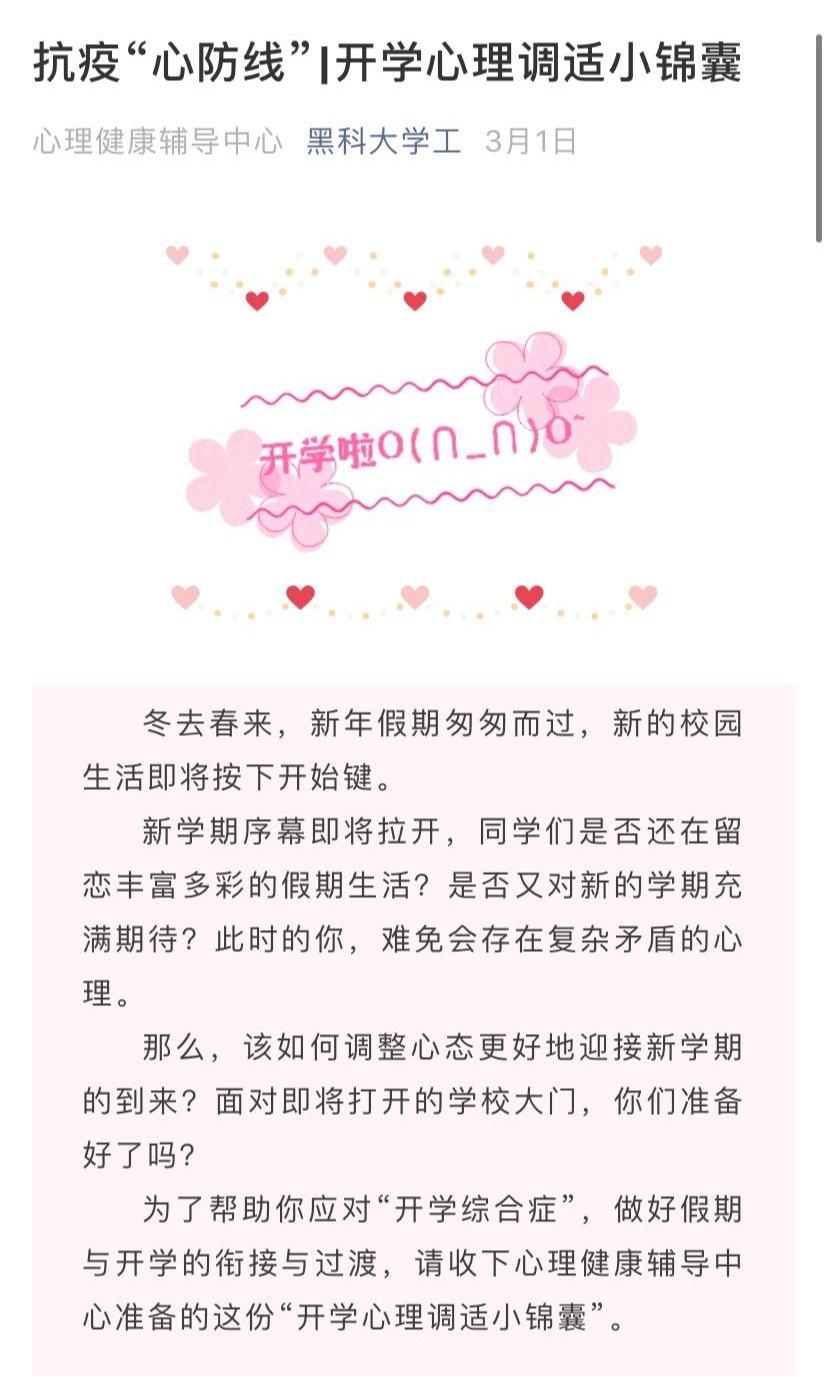 五是做好疫情防控常态化大学生心理健康帮扶。在大学生中开展积极组织开展心理委员、寝室心理联络员培训课程,通过官方微信推出有关“开学心理调适”2篇。并在全校范围内开展学生心理状况排查和心理异常零汇报制,对于重点学生,进行一对一回访,对排查出问题的学生进行网络家访,保证家校协同育人。