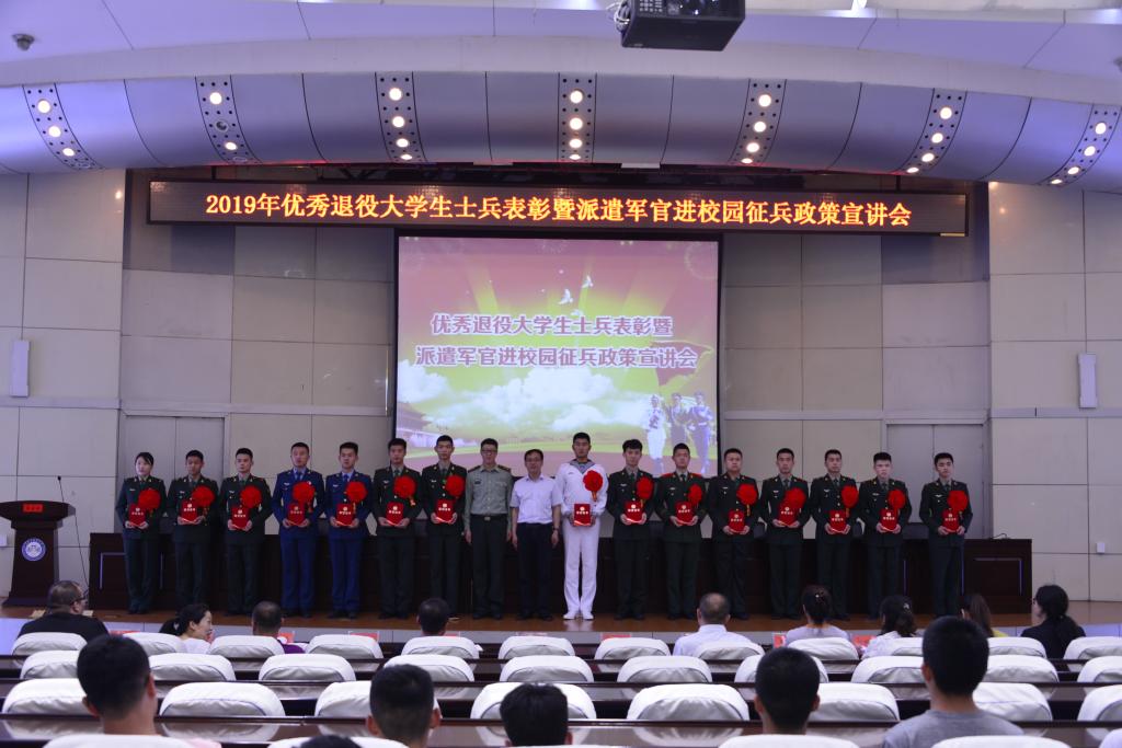 会上,学生处副处长刘庆华宣读了《华体官网网页版关于表彰2019年优秀退役大学生士兵的决定》;武装部部长薛立刚和省军区学军事教研室主任王欣研中校给全体优秀退役大学生士兵颁发了荣誉证书;优秀退役大学生代表马克思主义学院思政15-1班李海娟分享了自己在部队接受教育、淬炼成才的收获,让同学们感受到了生命的激昂和奋斗的色彩;今年应征报名学生代表矿业学院采矿18-4班郭政东作了表态发言,立志从军报国,军营建功立业。