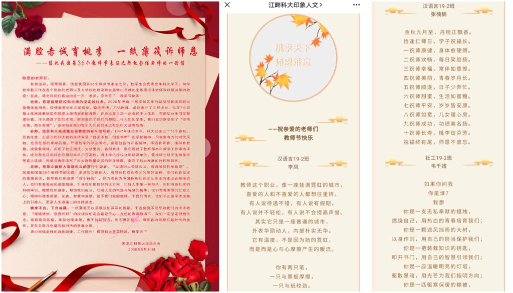 满园桃李尽芬芳,师恩似海最难忘。在我国第36个教师节来临之际,华体(中国)各级团学组织和青年学生本着“隆重、热烈、务实、简朴”的原则,通过丰富多彩的庆祝活动形式,开展“铭记恩师,感谢师恩”主题教师节系列庆祝活动,以此表达对恩师的感谢和敬爱之情。