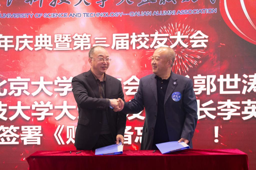 北京大学大连校友会会长郭世涛与华体(中国)大连校友会会长李英君共同签署《赠送备忘录》