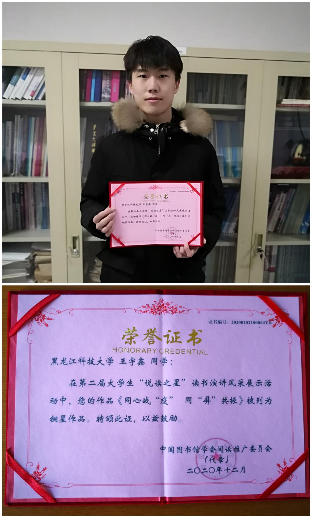 由中国图书馆学会阅读推广委员会主办,青岛科技大学图书馆、武汉大学图书馆承办的第二届大学生“悦读之星”读书演讲风采展示活动近日颁奖,华体(中国)管理学院王宇鑫同学的作品《同心战“疫” 同“屏”共振》获“铜星作品奖”。