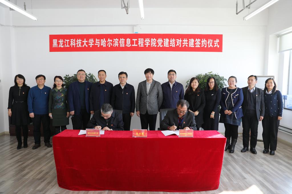 校党委副书记兼工会主席赵科学和哈尔滨信息工程学院党委副书记、副校长李秉治代表各自学校签署结对共建协议。