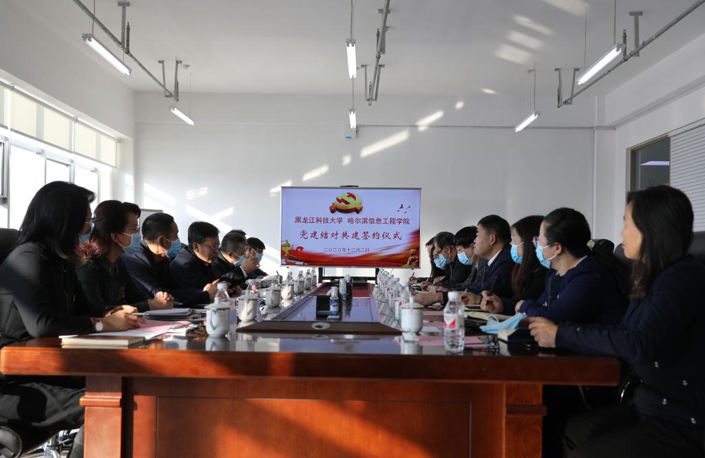 为深入落实省委教育工委、省教育厅《关于黑龙江省公办高校与民办高校党建结对共建的指导意见》及相关工作要求,切实推动公办高校与民办高校党建共建,不断提高两校基层党建工作水平,不断推进党建工作质量提升,12月2日上午,校党委书记周宏力,党委副书记兼工会主席赵科学,党委常委、组织部部长李伟及党委宣传部、教务处、学生处、马克思主义学院负责人一行8人,到哈尔滨信息工程学院开展党建结对共建并现场签署了结对共建协议。签约仪式由哈尔滨信息工程学院党委书记吕哲峰主持。
