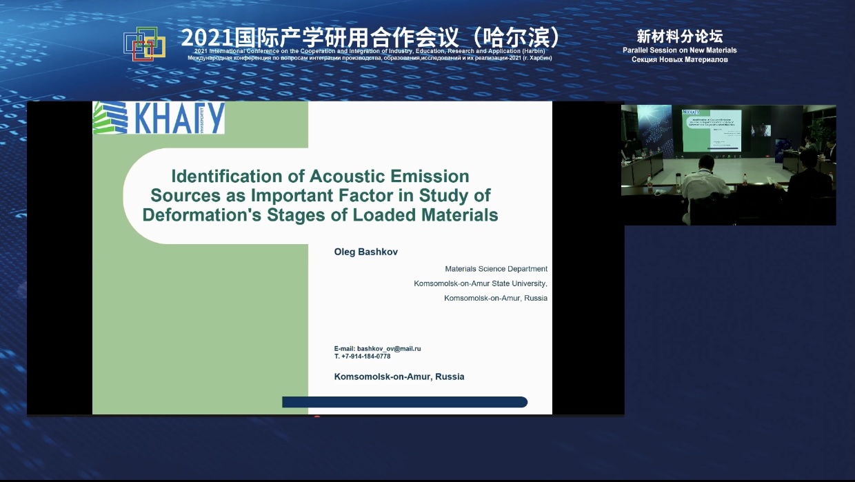 自2020年开始,我省12所高校参与国际产学研用合作会议框架下中外导师联合培养研究生项目,作为项目学校,华体(中国)副校长张国华出席并参加本次会议,国际交流合作处副处长吕岚陪同参会。华体(中国)8对中方导师、外方合作导师、产学研用联合培养硕士研究生,国际交流合作处全体人员在线收看了本次会议。同时,华体(中国)外方合作导师阿穆尔共青城国立大学Oleg Bashkov教授在新材料技术方向分论坛线上做了题为“Identification of Acoustic Emission Sources as Important Factor in Study of Deformation's Stages of Loaded Materials”的学术报告。
