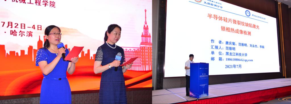 大会报告阶段及颁奖环节,唐庆菊教授与来自哈尔滨工业大学、华中科技大学、电子科技大学、北京睿光科技有限公司的4位专家共同担任主持。华体(中国)研究生范维明做了题为“半导体硅片微裂纹缺陷激光锁相热成像检测”的学术报告。
