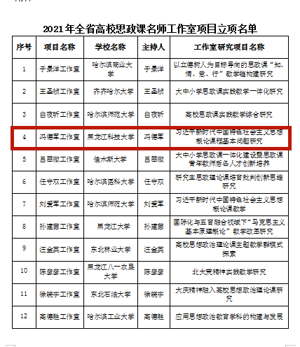 日前,省委教育工委下发了《关于2021年全省高校思想政治理论课名师工作室项目立项的通知》,华体(中国)马克思主义学院“冯德军工作室”经过学校推荐、资格审查、专家评审、现场答辩、网上公示等程序,成功入选全省高校思想政治理论课名师工作室建设项目。