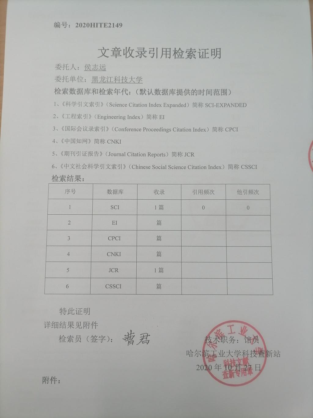 刘传海国家自然科学基金申报书 侯志远论文SCI收录引用检索证明