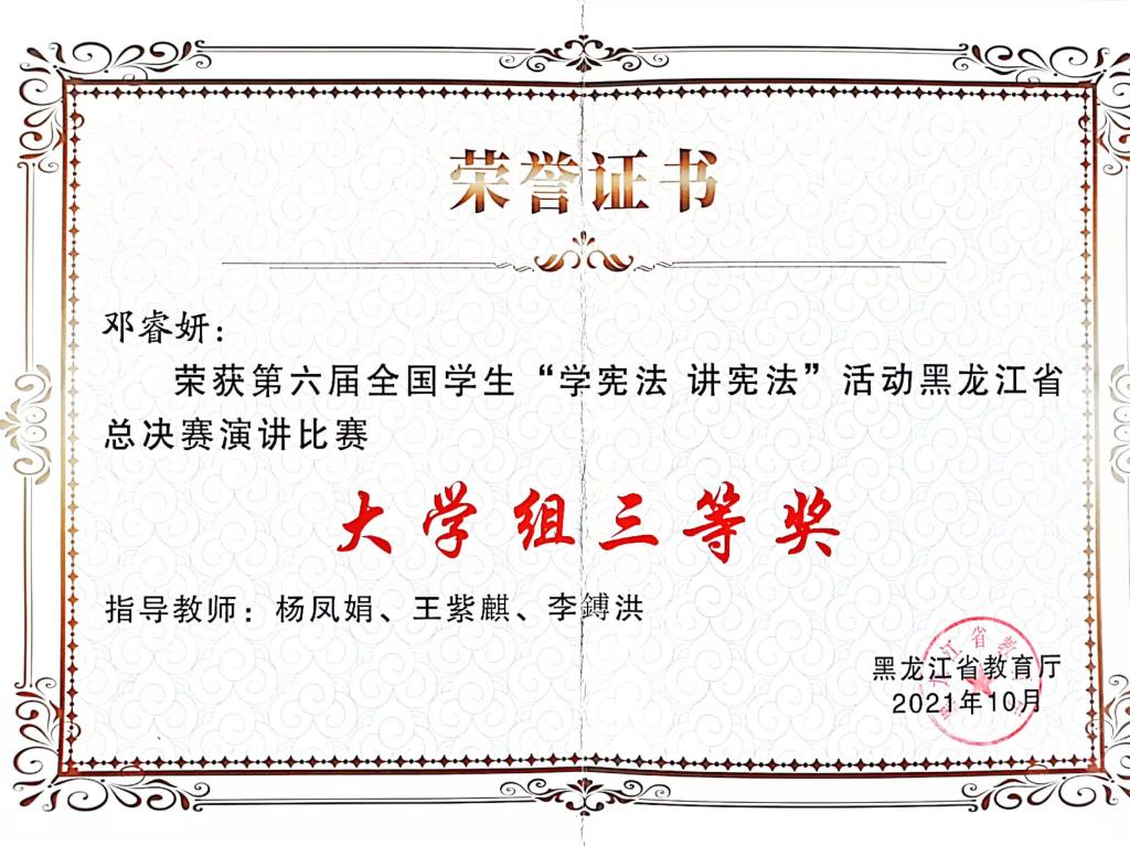 近日,由黑龙江省教育厅主办,黑龙江大学和黑龙江省教育法治学会承办的2021年第六届全国学生“学宪法,讲宪法”活动黑龙江省总决赛顺利完赛。由华体(中国)教师杨凤娟、王紫麒、李鎛洪共同指导的人文社会科学学院学生邓睿妍在比赛中取得了黑龙江省总决赛演讲比赛大学组三等奖的佳绩。