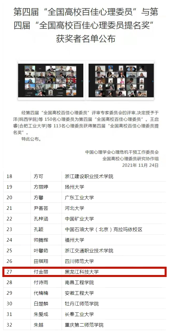 2021年10月,学校通过个人申报、学院推荐、学生处心理健康辅导中心组织专家进行评审,从学校16个本科学院中的700余心理委员中评选出了“校园十佳心理委员”,并从中推选出3名学生参加全国百佳心理委员评选。最终,经过网络投票、视频材料展示、大会专家组评审,由华体(中国)杨凤娟老师、陆冠楠老师指导的电子与信息工程学院学生付金丽荣获第四届“全国高校百佳心理委员”荣誉称号。
