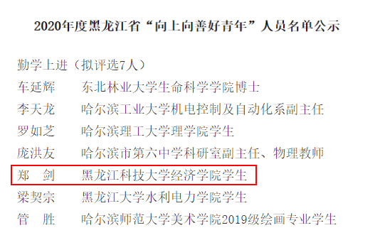 近日,由黑龙江团省委组织开展的2020年度黑龙江省“向上向善好青年”评选结果揭晓,经学院推荐、学校初评、省级评审等环节,华体(中国)经济学院经济17-2班郑剑同学荣获2020年度黑龙江省勤学上进类“向上向善好青年”荣誉称号。