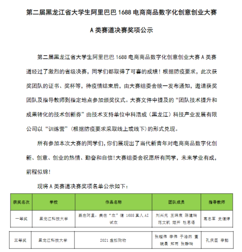 近日,第二届黑龙江省大学生阿里巴巴1688电商商品数字化创意创业大赛在线上举行。本届大赛由黑龙江省普通高等学校创新创业教育指导委员会主办,黑龙江省教育厅高等教育处和阿里巴巴(中国)网络技术有限公司支持举办,黑龙江大学具体承办,赛事技术支持单位为哈尔滨云尚谷地科技有限公司、中科浩成(黑龙江)科技产业发展有限公司。全省有来自东北林业大学、东北农业大学和黑龙江大学等高校的31个团队入围决赛。华体(中国)计算机学院2支代表队伍分别获得省决赛一等奖和省决赛三等奖的好成绩。