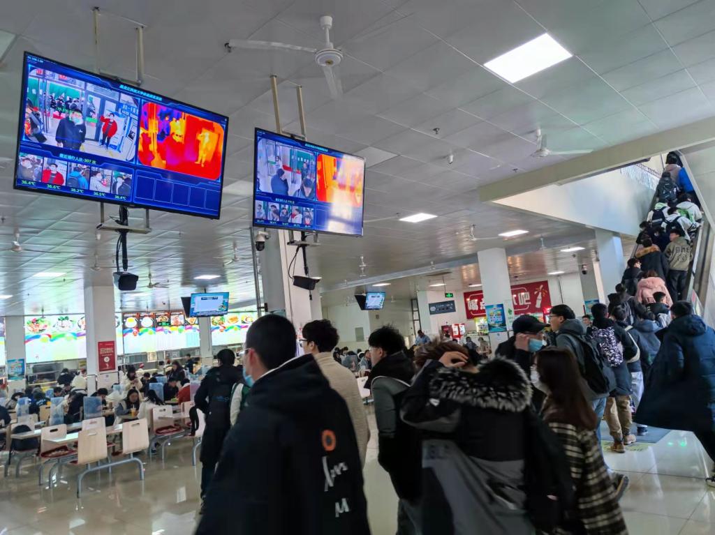 学校食堂沁芳园和沁香园安装了体温筛查系统,该系统采用双目红外热成像技术,具有可见可视、热源视图、通过抓拍、温度显示、报警抓拍功能。可快速无感测温,多人同时测温,高温自动抓拍报警,并且系统自动记录保存每日进出师生员工的抓拍照片和测温数据,并上传至管理平台,可以进行远程设置和管理,以备校园疫情防控数据查询和使用。该系统采用非接触,无感知的方式,安全、可靠、高效地解决了食堂高度聚集、高流动性情况下的体温实时筛查检测问题。
