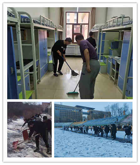 劳动教育,实践赋能,深入开展劳动教育课。劳动创造生命活力,劳动点亮青春底色。为强化劳动观念,弘扬劳动精神,全面提高学生劳动素养。各学院组织同学们拿起工具、参与劳动,打扫寝室卫生,学生志愿者充分利用课间时间开展校园清扫活动,及时清除道路积雪,全身心投入到劳动实践中,体验着劳动的快乐,传承了团结协作、吃苦耐劳、无私奉献的精神,使整个校园焕然一新,为新学期迎来了新气象。