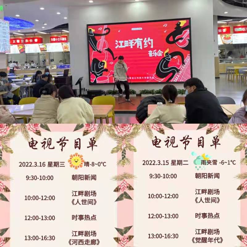 同时,小青梅也了解到校团委联合后勤工作处充分利用饮食中心改造升级后的良好环境,特别是利用新增设的媒体设施和舞台开辟了校园文化新阵地,校学生会利用新阵地将继续深化党史学习教育成果,持续开展“我为同学做件事”主题实践活动,结合不同时间段分别开设了《朝阳新闻》、《江畔剧场》、《时事热点》、《“江畔有约”音乐会》等栏目,沁芳园二楼变成了华体官网网页版校园里的“网红餐厅”,丰富多彩的栏目极大的丰富了我们的课余生活,这样的校园真是惹人爱呀!