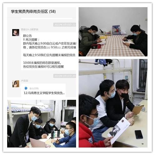 四、创新形式,织密学风防线。学工部门认真贯彻落实“停课不停学”的要求,积极采取多种措施加强学风建设,切实保障学生线上学习效果。建立了“课前提醒、课上巡视、课后反馈”学风保障机制,辅导员前一日都会提醒各班级做好第二天上网课的准备,上课期间进入线上课堂清点学生人数,课下向任课教师了解学生上课状态等,保证学生上网课的效果。建立学生党员学风包保责任区,学生党员每日深入自己的责任区寝室中,督促检查学生上网,经常性与学生就疫情期间如何在线上高效学习进行了交流与指导,确保学生线上学习的状态和质量。