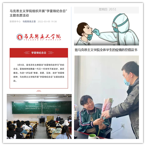 二、搭建平台,铸牢思想防线。学院积极搭建和利用线上平台,做好学生思想引领工作。组织开展了“践青春使命,强国必有我;学习新思想,做好接班人”主题思想教育系列活动。开展了以“担当责任奋发有为,在服务同学中绽放青春之花”为主题学生骨干实践锻炼活动。有序开展了首周教育、“开学第一课”、“学雷锋纪念日”系列活动。向全体学生发出了“致马院学生的疫情防控倡议书”。辅导员和班主任召开线上年级大会和班会12次,让全体学生熟悉防疫政策,理解支持配合学校疫情防控工作。