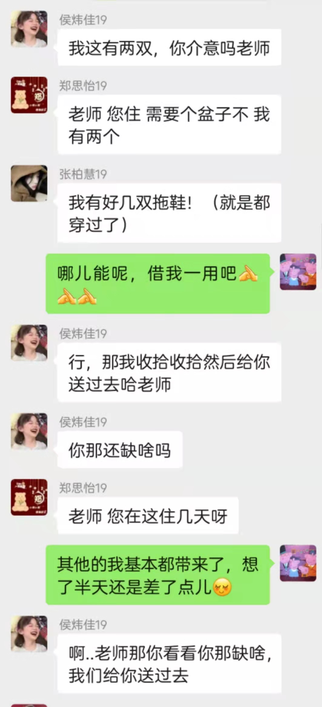 得之,为心之温暖。外国语学院女生心思细腻真是出人意料,在赵老师打开宿舍的门的瞬间,窗明几净,坐垫、纸巾甚至是热水都已准备妥当,原来,当孩子们知道老师要和她们一起住校的时候,悄悄到门卫阿姨处借来了钥匙准备好了一切。群里每天都有人问老师这个有没有啊、那个缺不缺啊、一个人住没意思到她们寝室住啊,嘘寒问暖,使人感动。渐渐地,通过这段时间的相处,她和学生们更加的亲昵,这一帧帧、一幕幕的温暖,虽不像雪中送炭,却似片片锦丝,萦绕心间。在寒冽的冬末,作为老师,在学生身上感受到了初春的点点柔情与温馨。虽有舍,与此时,与她而言,亦值得。得之,亦为之幸呀。
