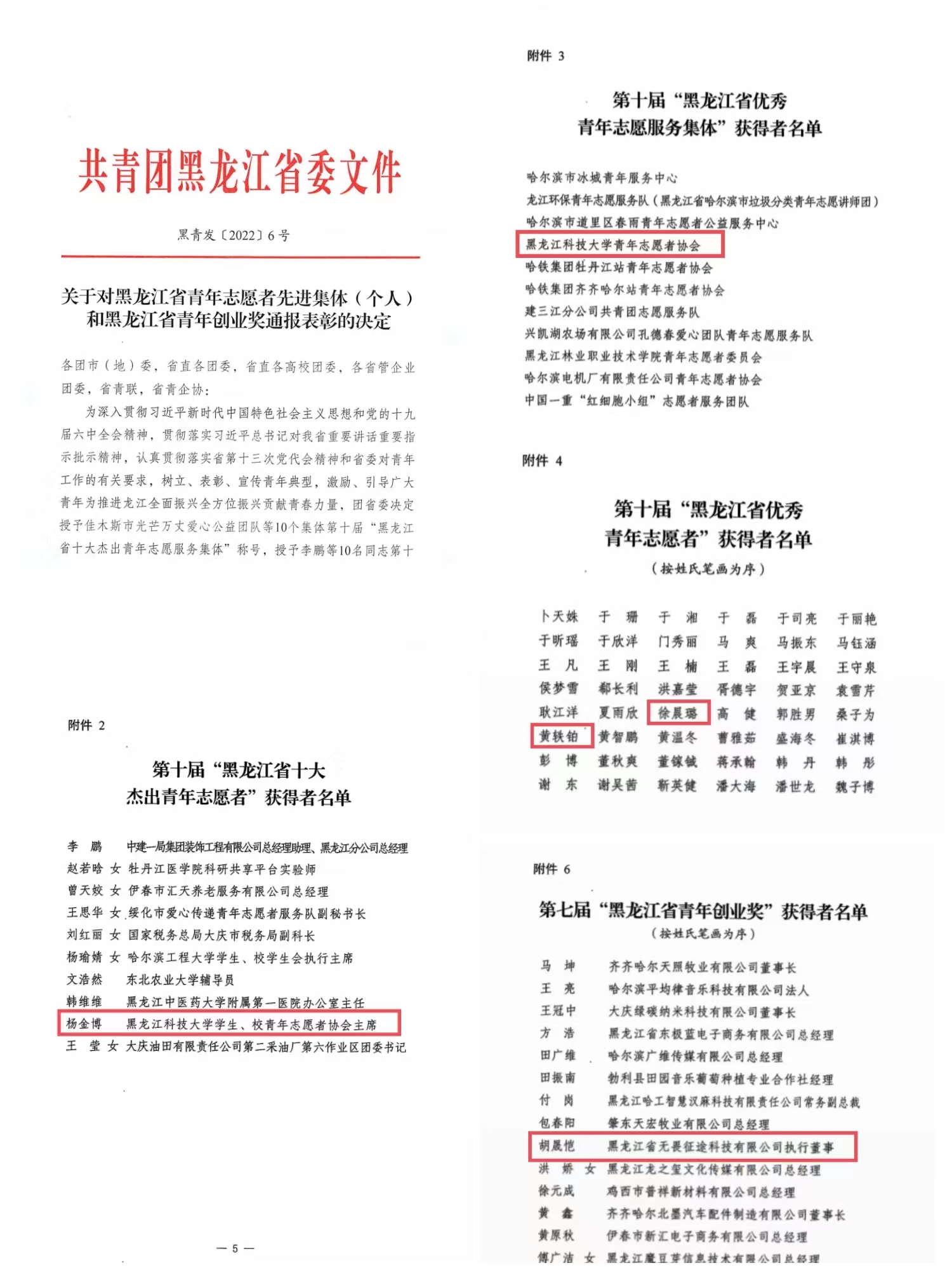 近日,在团省委下发的《关于对黑龙江省青年志愿者先进集体(个人)和黑龙江省青年创业奖通报表彰的决定》中,华体(中国)喜获佳绩:学校青年志愿者协会被授予第十届“黑龙江省优秀青年志愿服务集体”;安全工程学院安全19-1班杨金博被授予“黑龙江省十大杰出青年志愿者”,人文社会科学学院社会学19-1班徐晨璐、研究生学院研21-19班黄轶铂被授予“黑龙江省优秀青年志愿者”;原计算机与信息工程学院计算机专业2019届毕业生胡晟恺被授予第七届“黑龙江省青年创业奖”。
