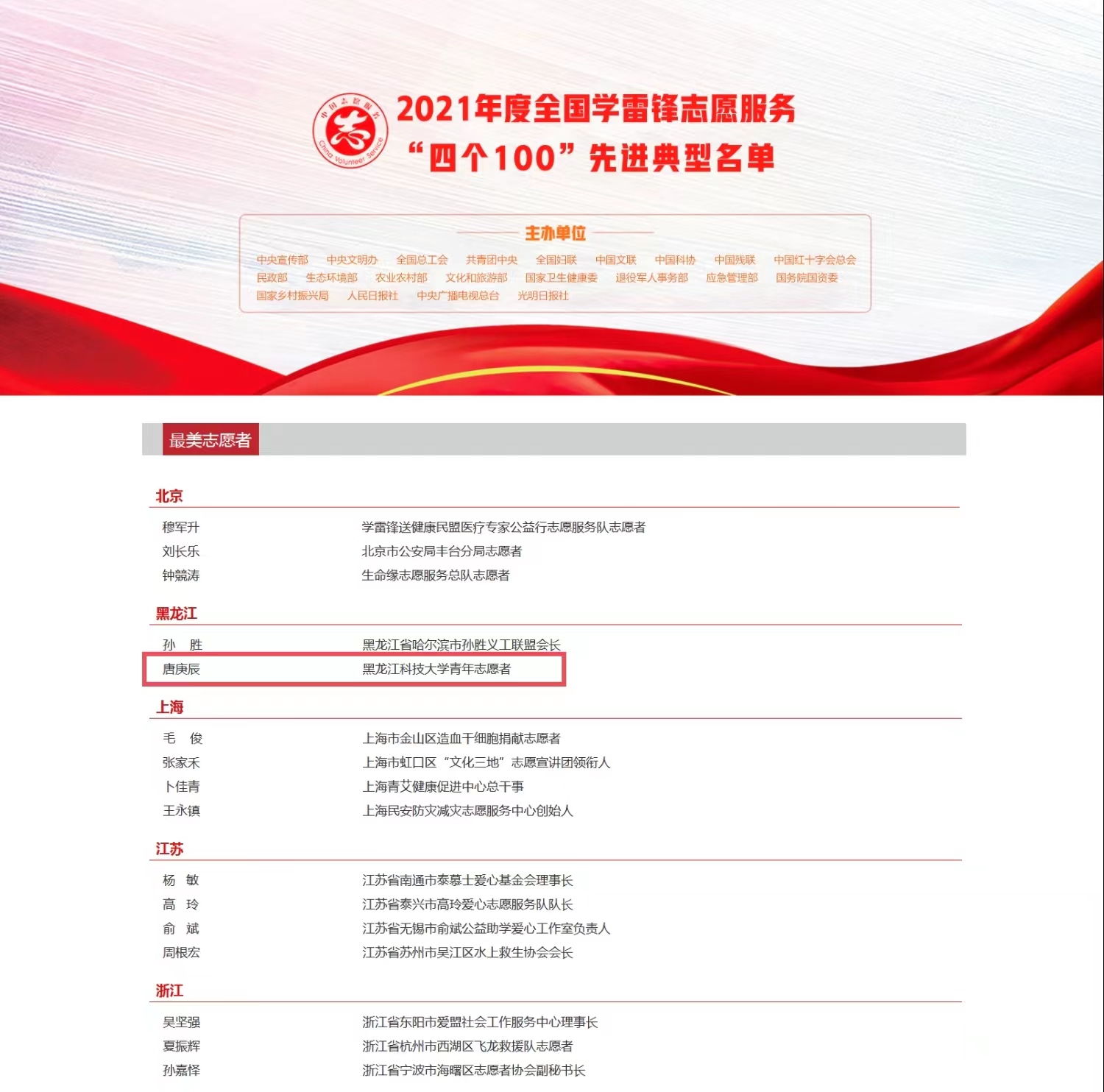 近日,中央宣传部、中央文明办、全国总工会、共青团中央等部门和单位共同组织开展的2021年度全国学雷锋志愿服务“四个100”先进典型宣传推选活动中,华体(中国)唐庚辰同学被授予“最美志愿者”荣誉称号。唐庚辰同学是本次被表彰的全国100名“最美志愿者”中唯一一名高校本科生,是迄今为止华体(中国)青年志愿者所获得的最高荣誉。