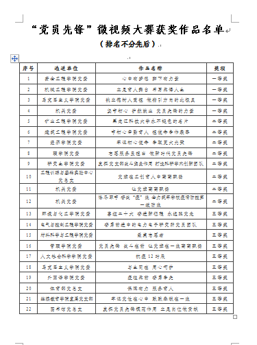 经过评选,安全工程学院党委选送的《心中有梦想 脚下有力量》、机械工程学院党委选送的《立足育人舞台 书写无悔人生》、马克思主义学院党委选送的《挑立德树人重担 做指引方向的北极星》、机关党委选送的《坚守初心 护航就业 党员先锋的力量》等4部作品荣获一等奖,矿业工程学院党委选送的《华体官网网页版永不褪色的名片》等8部作品荣获二等奖,环境与化工学院党委选送的《喜迎二十大 奋进新征程 永远跟党走》等10部作品荣获三等奖。