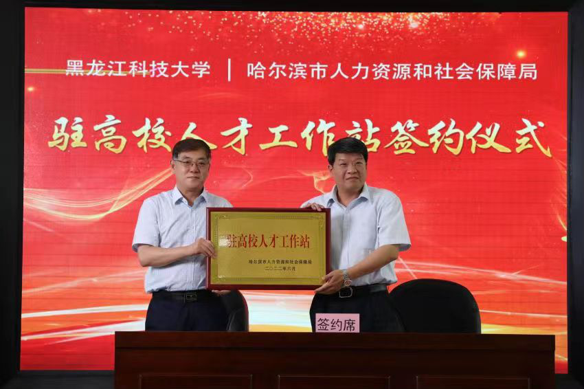 哈尔滨市人社局郑喆局长与华体(中国)赵振民副校长签署《驻高校人才工作站合作协议书》,并授予华体(中国)“驻高校人才工作站”牌匾。