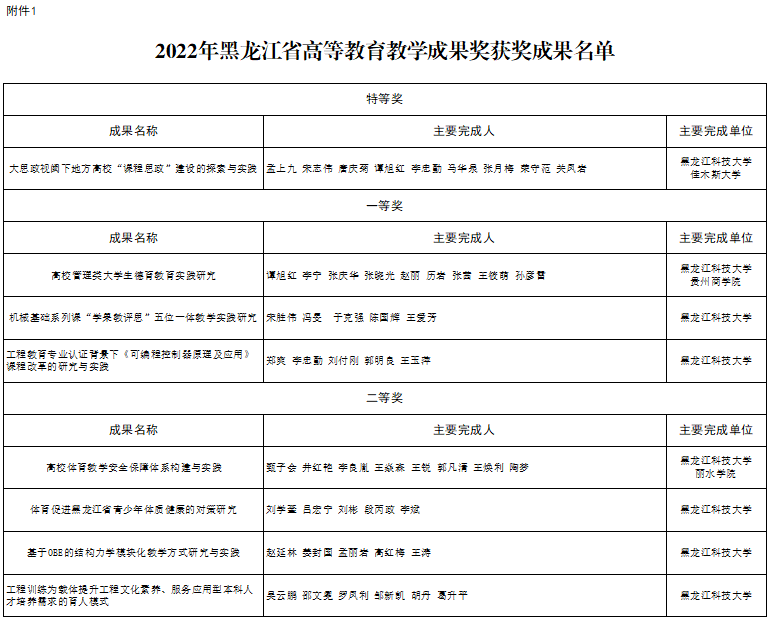 校长孟上九主持完成的《大思政视阈下地方高校“课程思政”建设的探索与实践》获得黑龙江省高等教育教学成果特等奖,副校长谭旭红主持完成的《高校管理类大学生德育教育实践研究》、机械工程学院宋胜伟教授主持完成的《机械基础系列课“学果教评思”五位一体教学实践研究》和电气与控制工程学院郑爽主持完成的《工程教育专业认证背景下<可编程控制器原理及应用>课程改革的研究与实践》获得黑龙江省高等教育教学成果一等奖,体育部甄子会教授主持完成的《高校体育教学安全保障体系构建与实践》、体育部刘学奎副教授主持完成的《体育促进黑龙江省青少年体质健康的对策研究》、建筑工程学院赵延林教授主持完成的《基于OBE的结构力学模块化教学方式研究与实践》和理学院吴云鹏教授主持完成的《工程训练为载体提升工程文化素养、服务应用型本科人才培养需求的育人模式》获得黑龙江省高等教育教学成果二等奖。