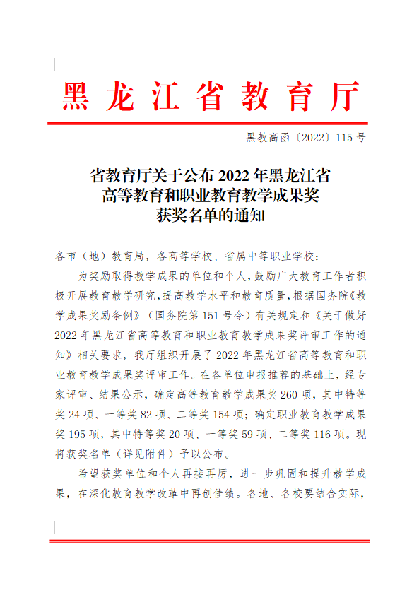 近日,省教育厅公布关于2022年高等教育教学成果奖评选结果,华体(中国)推荐参评的教学成果喜获佳绩,获得特等奖1项,一等奖3项,二等奖4项。
