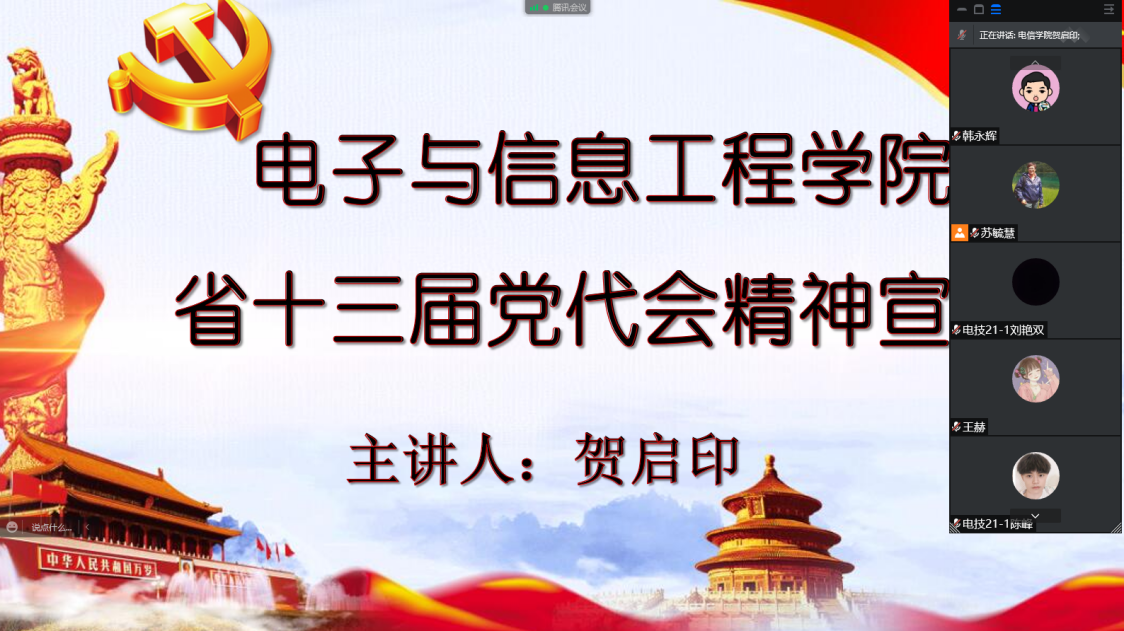 为深入学习贯彻落实省第十三次党代会报告精神,6月23日上午电信学院党委书记贺启印通过腾讯视频会议作了省第十三次党代会报告精神专题宣讲,学院全体教职工及学生党员代表参加了会议。
