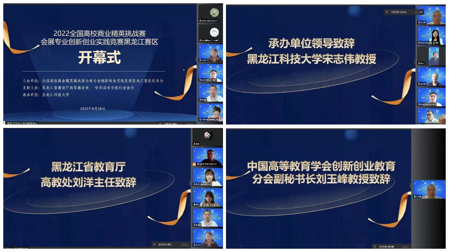 黑龙江省教育厅高教处主任刘洋,中国高等教育学会创新创业教育分会副秘书长、黑龙江省普通高等学校创新创业工作指导委员会副秘书长、黑龙江省创业教育学会秘书长刘玉峰,中国国际贸易促进委员会商业行业委员会、全国高校商业精英挑战赛组委会姚歆教授分别致辞。黑龙江赛区秘书长、经济学院院长孙永波做有关竞赛实况和评审规则的说明,哈尔滨商业大学会展经济与管理专业学生孙雨亭代表全体参赛学生进行发言,华体(中国)经济学院专创融合跨境电商实验班负责人籍丹宁教授代表全体指导教师进行发言,黑龙江生态工程职业学院会展策划与管理专业曲思嘉同学代表全体参赛学生进行宣誓,全国高校商业精英挑战赛会展专业创新创业实践赛吉林赛区负责人赵可心代表全体裁判员进行宣誓。
