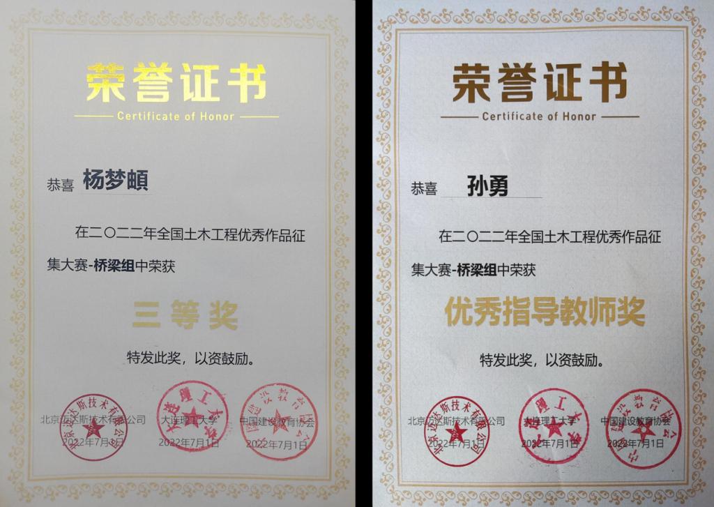 近日,由中国建设教育协会校企合作专委会主办,大连理工大学承办,北京迈达斯技术有限公司协办的“2022年全国土木工程优秀作品征集大赛”线上决赛落下帷幕并颁发了获奖证书。华体(中国)建筑工程学院教师孙勇指导的道路桥梁与渡河工程2018级杨梦頔同学,获得桥梁组全国三等奖,参赛作品为该同学的毕业设计《佳木斯松花江特大桥冬季施工大体积混凝土温度效应分析》。
