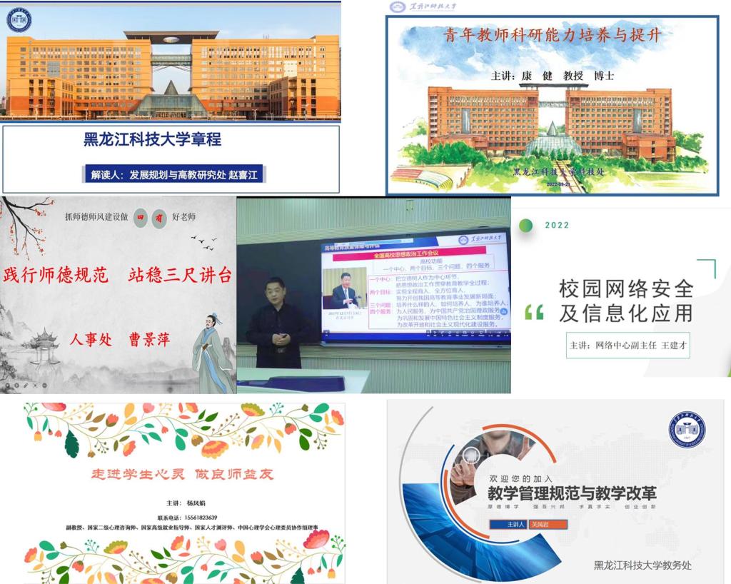 政策解读模块。评估中心主任吴卫东教授以《教学质量管理与考核》为题,详细介绍了中心的工作职责、督导运行机制;发展规划处处长赵喜江教授以《大学章程内容解读》为题,介绍了学校办学发展历程和沧桑巨变;科技处处长康健教授以《青年教师科研能力培养与提升》为题,对新教师进行科研业务能力培训;人事处副处长曹景萍教授以《践行师德规范站稳三尺讲台》为题,明确了好的师德师风是对一名老师的首要要求;教务处副处长关凤岩以《教学管理规范与教学改革》为题,详细解读教学管理规范及教学改革目标;学生处副处长杨凤娟以《走进学生心灵做良师益友》为题,强调重视学生心理健康的重要性和成为学生良师益友的必要性;网络中心副主任王建才以《校园网络安全及信息化应用》为题,介绍了校园网络服务流程和使用,强调网络信息安全意识的重要性。