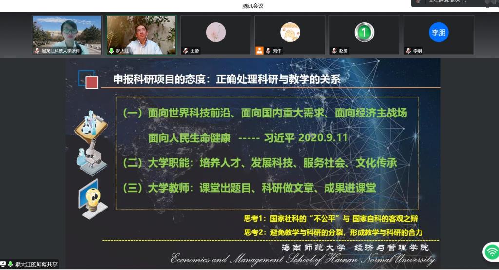 郝大江教授论述了申报哲学社会科学领域高水平科研项目的意义和方法,解答了如何正确处理科研与教学的关系,分析了注重团队合作的重要性;他从科研项目申报的选题、撰写(现状综述、研究内容、形式规范)等方面进行系统讲解,进一步指明了增强科学研究能力的重要途径,对哲学社会科学研究具有重要的指导意义。
