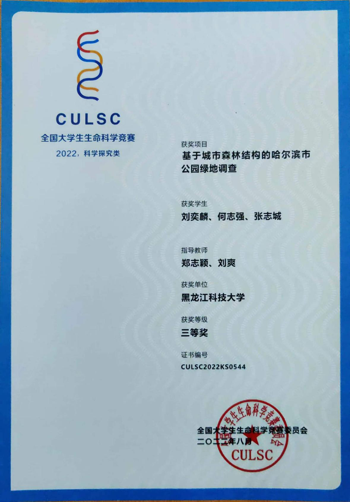 近日,由全国大学生生命科学竞赛委员会、高等学校国家级实验教学示范中心联席会及《高校生物学教学研究(电子版)》杂志社主办,由河南师范大学承办的2022年全国大学生生命科学竞赛(科学探究类)决赛落下帷幕,华体(中国)建筑工程学院教师郑志颖、刘爽指导风景园林专业学生刘奕麟、何志强、张志城完成的参赛作品“基于城市森林结构的哈尔滨市公园绿地调查”在比赛中获得三等奖。