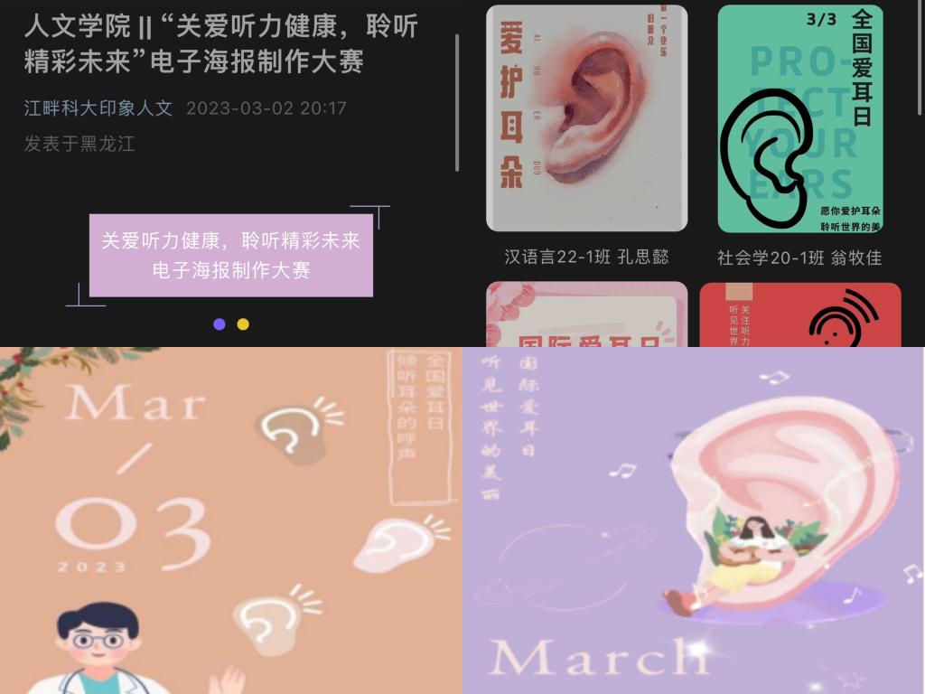 开展“关爱听力健康,聆听精彩未来”电子海报大赛。学院团委结合3月3日全国“爱耳日”,开展宣传教育活动,普及听力健康科学知识。在活动中,学生们了解了护耳、爱耳知识,提高了同学们对护耳重要性的认识,减少损伤听力的不当行为,在日常生活中有利于推动学生养成健康用耳的好习惯。