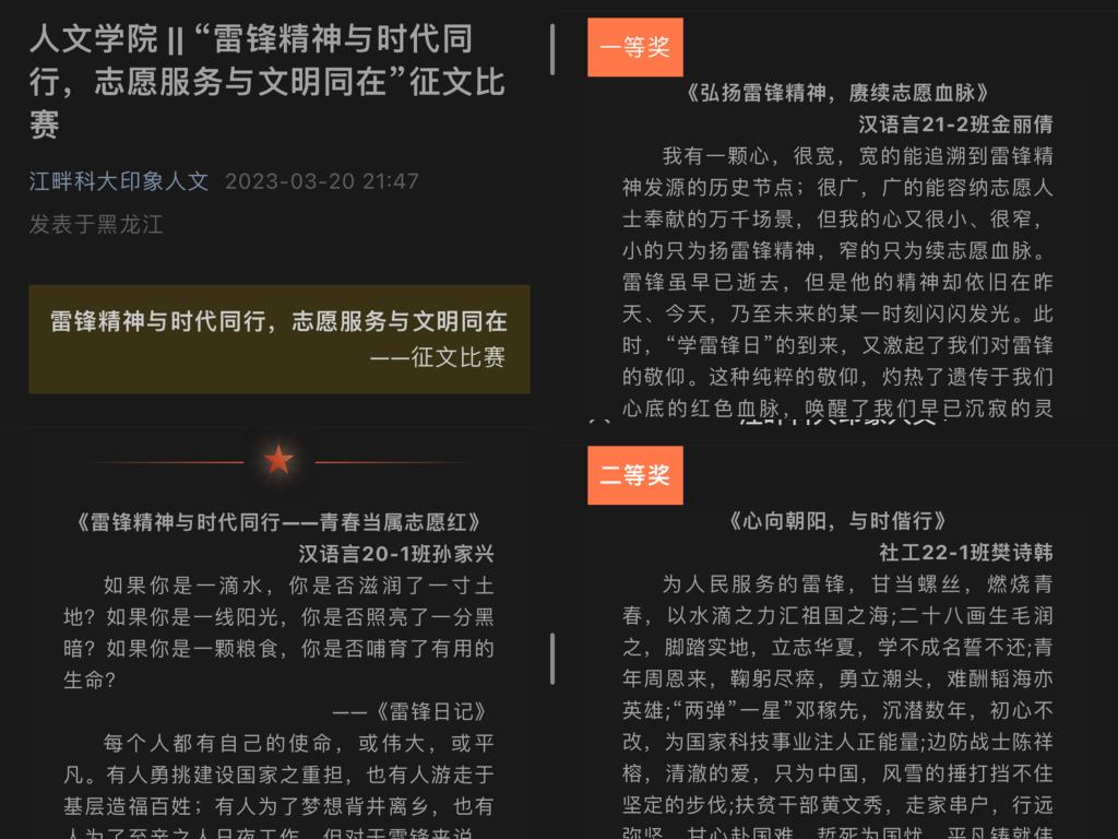 开展“雷锋精神与时代同行,志愿服务与文明同在”征文活动。同学们通过文字进一步弘扬新时代伟大的雷锋精神,在学院内形成“向雷锋同志学习”的良好风尚,引导学生进一步形成正确的人生观、价值观、世界观,努力做雷锋精神的弘扬者,成为学雷锋的自觉践行者。