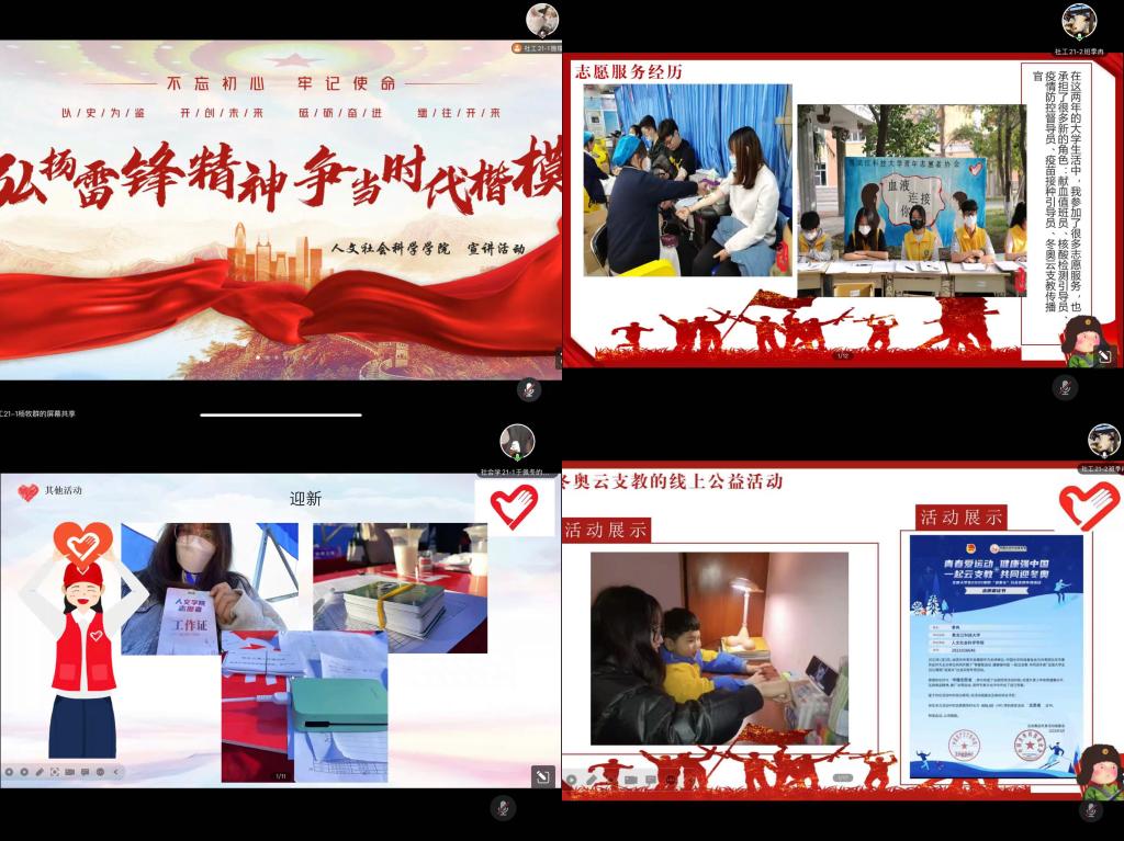 开展“弘扬雷锋精神,争当时代楷模”志愿者服务经验分享会。宣讲活动由2022年度全省优秀志愿者银奖获得者社会学21-1班于佩冬和全省优秀志愿者铜奖获得者社工20-2班蒋茗涓、社工21-2班季冉三名优秀的志愿者同学做经验分享。分享的内容主要围绕“志愿服务经历”、“志愿服务心得体会”、“如何完整的参与一次志愿活动”等三个主题展开。三位志愿者用亲身经历和心路历程向同学们讲述并传达了志愿服务精神,让同学们从不同的角度感受到志愿者这一角色在社会中的重要性,积极展现了人文学子勇于担当、甘于奉献的精神风貌。