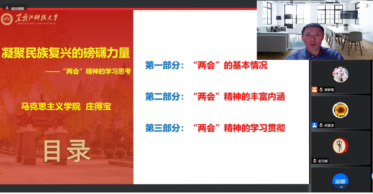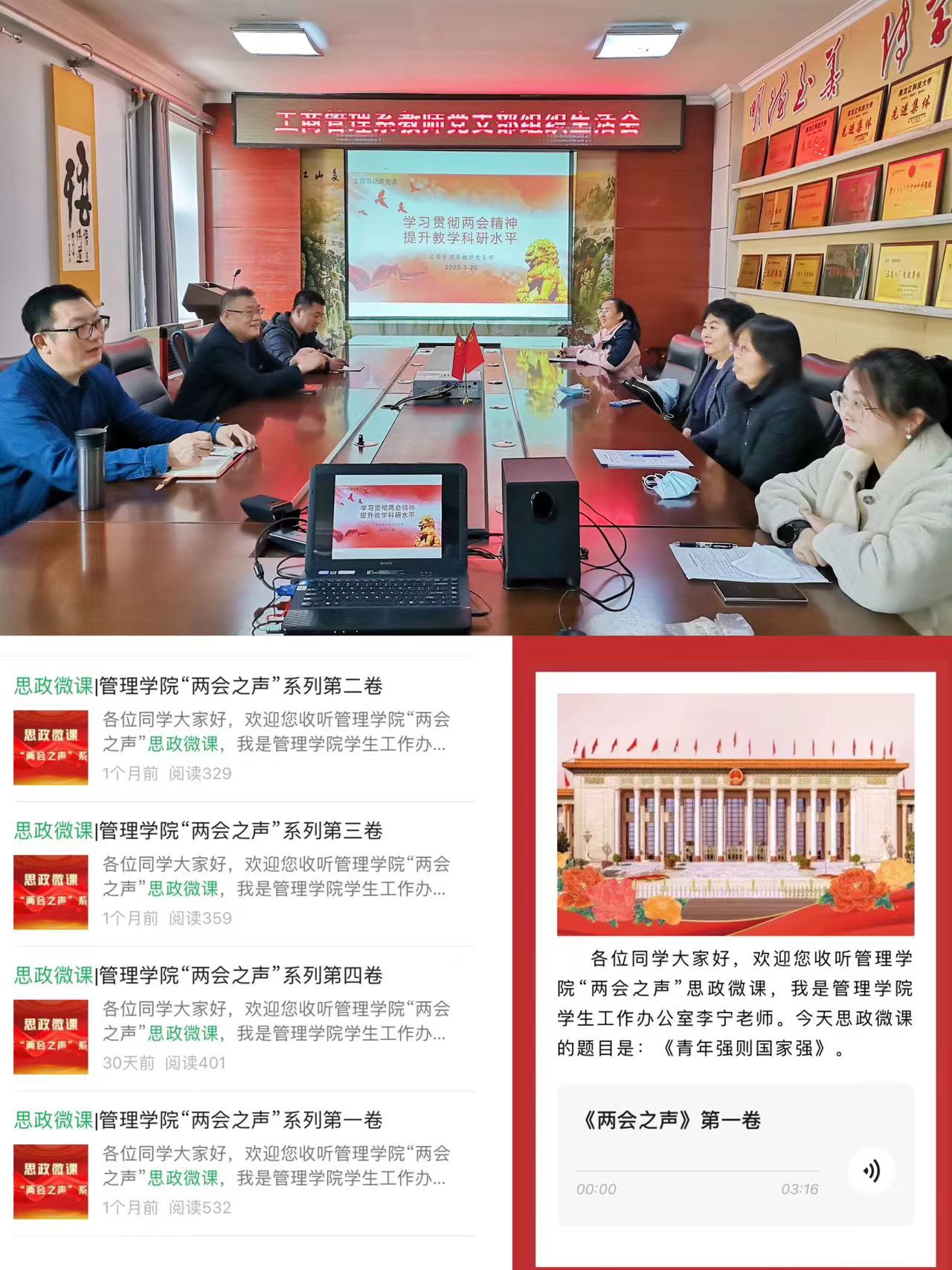 二是邀请思政课教师做“两会”精神主题宣讲。4月12日,管理学院线上召开了全国两会精神宣讲报告会暨全院教职工政治理论学习会议。邀请华体(中国)马克思主义学院副教授庄得宝对2023年全国两会精神作专题宣讲,会议由学院党委书记何景洋主持。