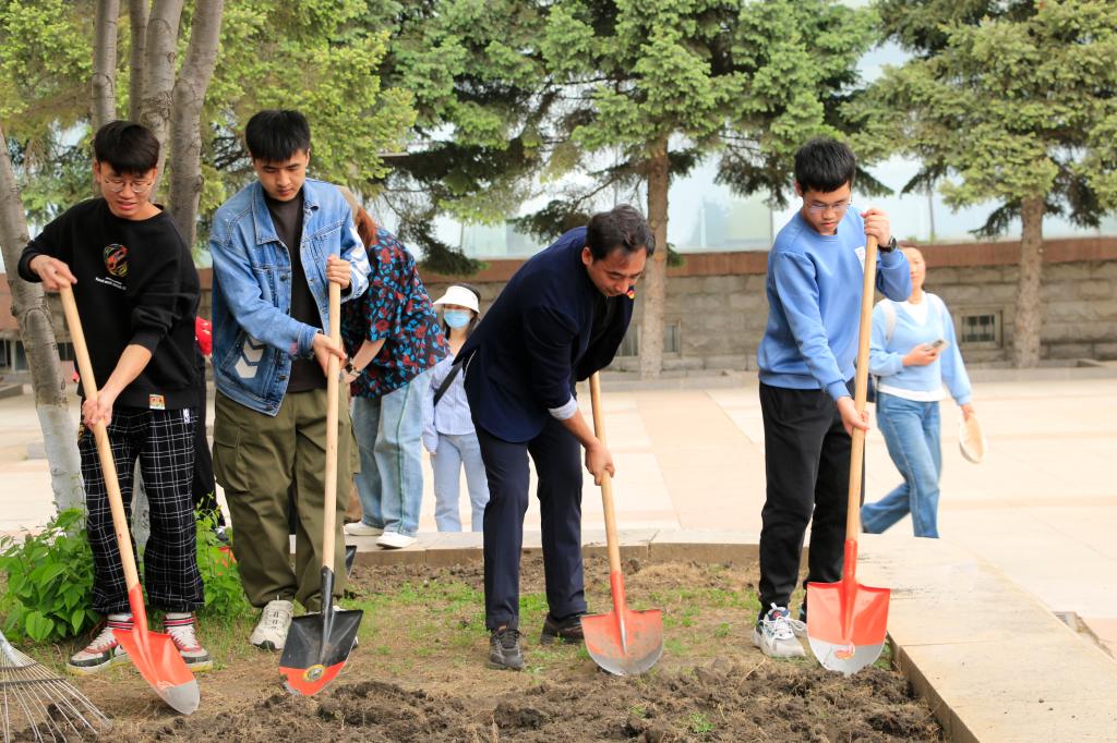 活动现场,大家精神饱满、跃跃欲试,在后勤管理处老师的指导下,手持铁锹、耙子等工具分工协作,互相配合,铲土、翻松、除草,在开垦后的花坛里共同撒下了一颗颗草籽。