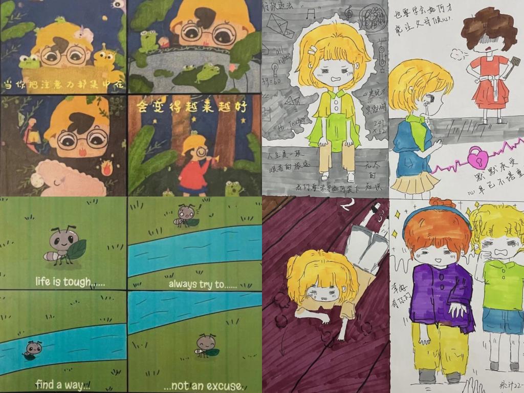 绘画之形,心灵之美。以学生自主设计的心理绘画和心情连环画去呈现学生们的内心世界。心理连环画作品能够帮助学生进一步增强对自我情绪的觉察和接纳意识,提升自我情绪的调节和管理能力。通过作品反映了学生的心理现象、心理体验和人生思考,可以深入地了解学生们的内心世界,也更便于掌握学生们的心理状况。