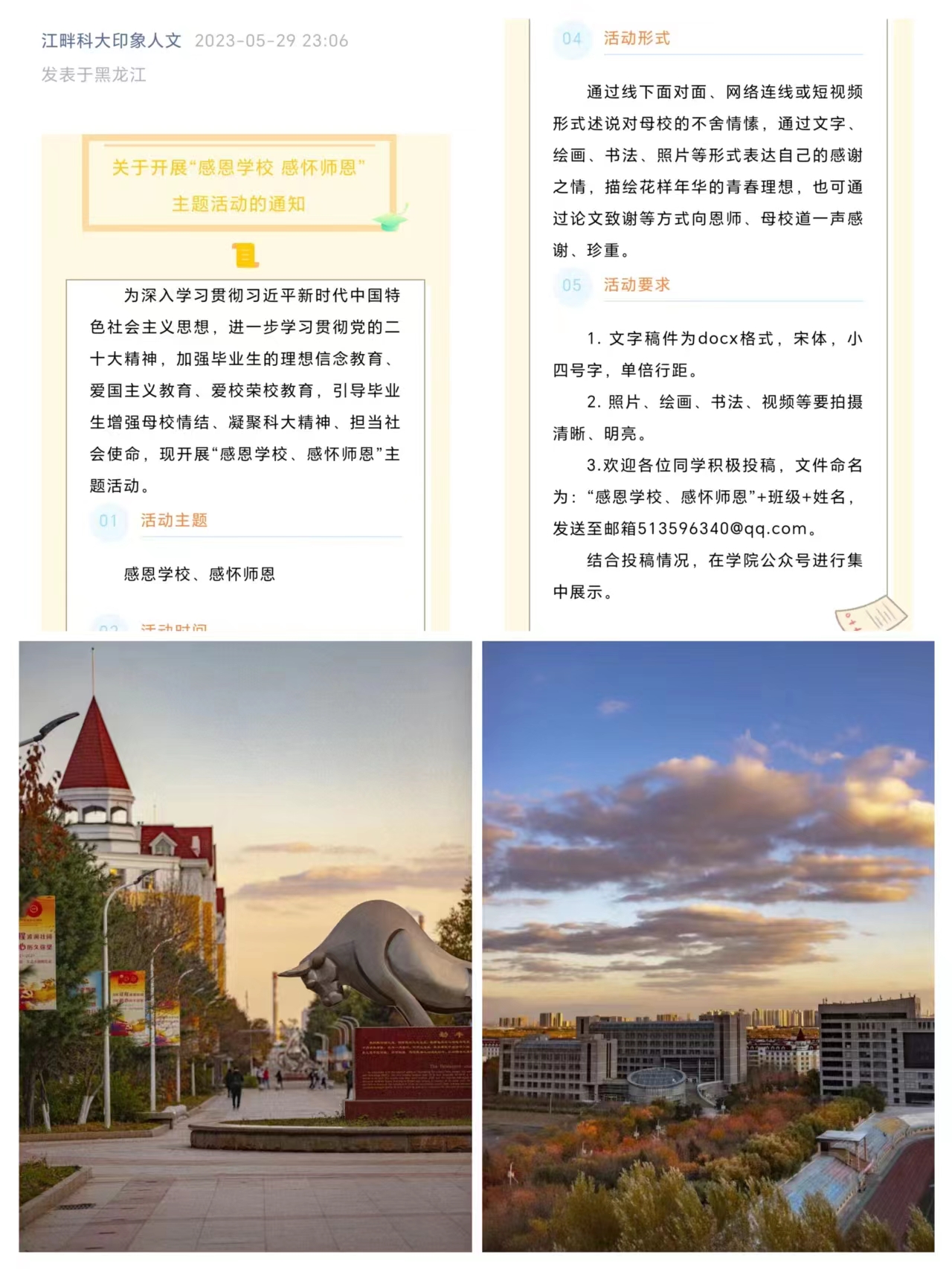 感恩表露,传递华体官网网页版情怀。组织毕业生通过线下面对面、网络连线、短视频等多种形式,述说对母校的不舍情愫,通过文字、绘画、照片的形式诉说对母校和恩师的深情眷恋。引导毕业生知校爱校荣校,深切感悟“厚德博学,强吾兴邦”的校训,用自己的实际行动为学校增光添彩。