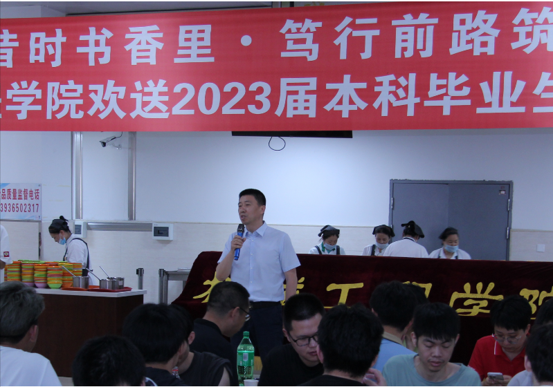 一盘饺子,一份温暖,一片真情!6月19日上午,机械工程学院在学校沁香园二楼举办了“留恋昔时书香里•笃行前路筑梦中”——欢送2023届毕业生饺子宴。学院党委书记吕刚,副院长唐庆菊,副院长齐立涛,副处级辅导员毕强,辅导员,毕业班班主任和各班级毕业生代表参加了本次活动。