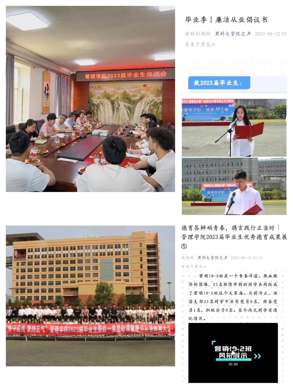 护航--毕业生离校教育。学院开展行走的党课、德育答辩成果展示、主题团活、廉洁从业教育大会以及毕业生座谈会等活动,通过“管院之声”微信公众号平台发布《廉洁从业倡议书》、《安全离校倡议书》,号召毕业生恪守职业道德、廉洁从业、文明离校,将思政教育、就业观教育、廉洁从业教育等融入毕业生教育各个环节,进一步坚定了管院青年学生不忘初心跟党走的政治选择和自觉看齐追随的政治品格,号召管院青年学生心怀感恩,始终牢记母校嘱托,坚定信念,砥砺前行,在各自的岗位上创造无悔的青春业绩。