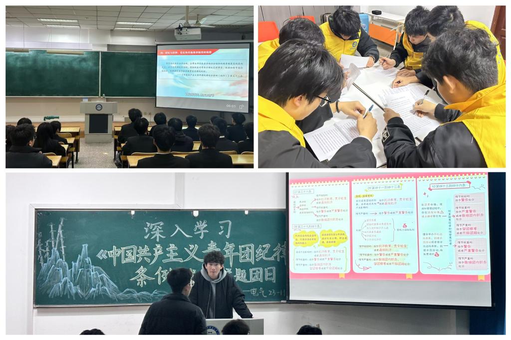 校青年志愿者协会团支部结合考风考纪、学生日常管理规定进行深入研讨,在研讨中以案例让团纪“活”起来。电气学院团委对《中国共产主义青年团纪律处分条例(试行)》思维导图进行原原本本学,帮助团员青年更直观、更系统地理解《条例》内容,并将内容要点提炼、重点知识总结归纳,持续推动青年学生学清楚,用明白。材料学院团委、电信学院团委、建工学院团委、计算机学院团委,将《条例》与《华体官网网页版学生管理规定》进行逐条对照解读,采取“一案一点评、一案一剖析”的方式,提升学习质效。