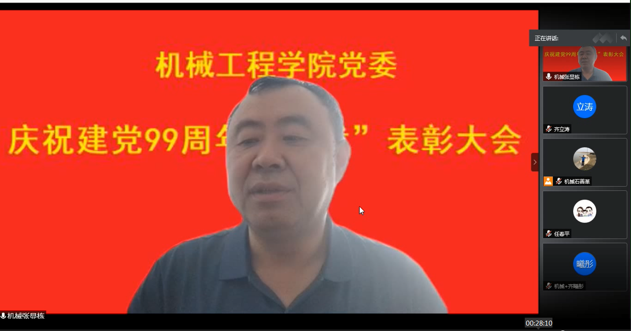 为庆祝中国共产党成立99周年,激励基层党组织和师生党员干事创业热情,不断巩固和深化“不忘初心、牢记使命”主题教育成果。7月1日下午,机械工程学院党委通过视频会议召开了庆祝中国共产党成立99周年“先优”表彰大会。学院全体教师党员和部分学生党员代表参加,会议由党委副书记张显栋主持。