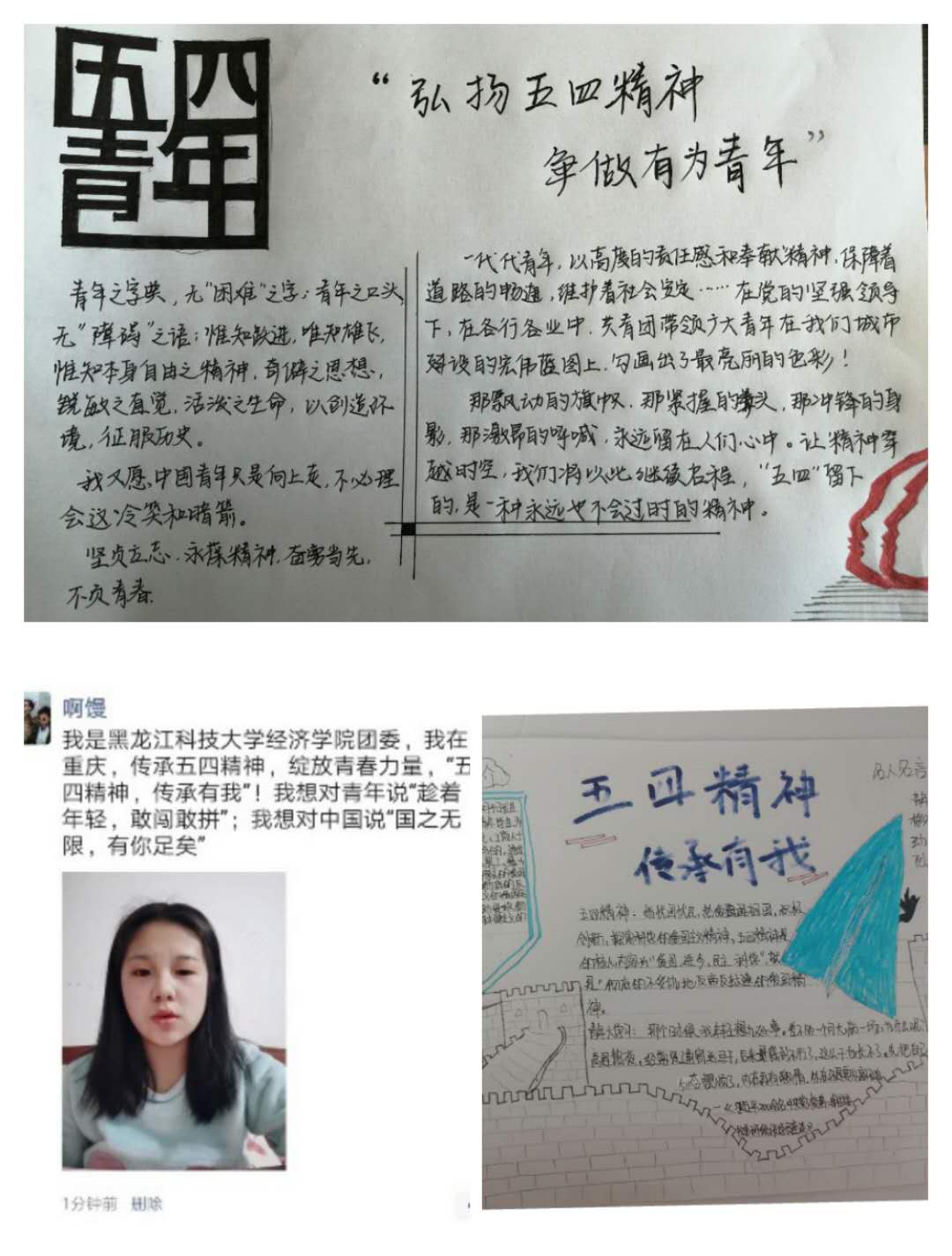 经济学院团委面向全体青年学生举办“五四精神·传承有我”全团网络主题传递活动,经济18-2班王旭航,经济19-2班高琳制作五四主题海报、国贸18-1班全体同学录制《五四,为青春喝彩》短视频、金融19-1班魏文琪录制歌曲为青春高歌,作品展示了广大青年积极向上、奋发有为的精神风貌。5月4日当天@共青团华体官网网页版委员会的微博、微信、QQ空间开设的#五四精神,传承有我#话题专区将作品发布,带动全体青年学生把炽热的爱国热情转化为强国动力,让五四精神常青。