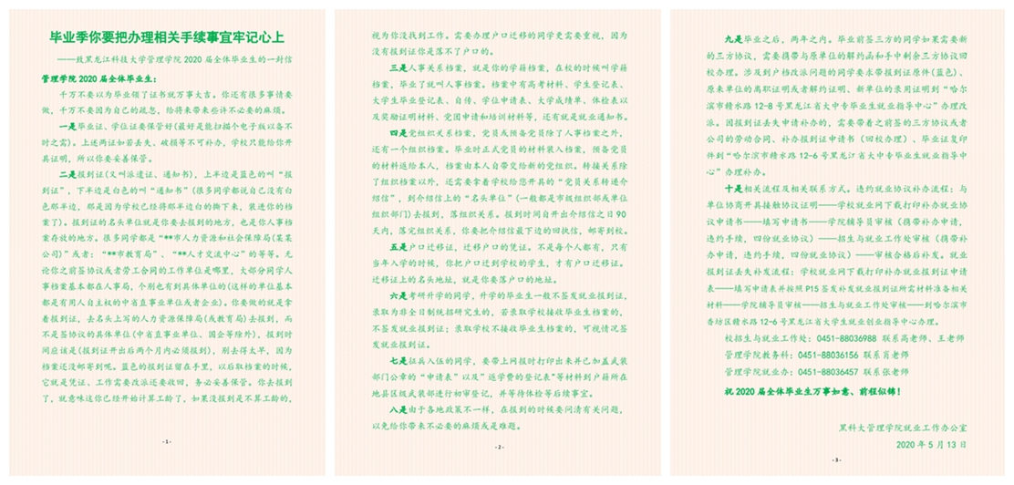 为了让毕业生更详细、更全面的了解毕业过程中需要办理的相关手续等具体事宜,5月13日管理学院为2020届毕业生精心制作了《毕业季你要把办理相关手续事宜牢记心上》——致华体官网网页版管理学院2020届全体毕业生的一封信。详细梳理了办理毕业各种相关手续的流程和注意事项,主要涉及到学生关心的毕业证、学位证以及报到证和档案派遣等相关事宜,为毕业生提供了贴心的一站式服务。