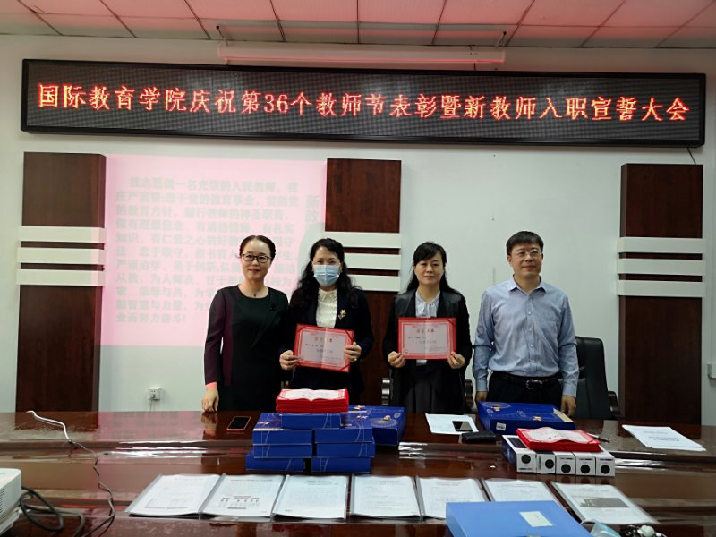 在全国庆祝第36个教师节来临之际,国际教育学院加强领导,周密安排,按照学校党委的统一部署,结合本单位实际,9月9日在科高0606举行了表彰暨新教师入职宣誓大会。国际教育学院全体教师参加了会议。会议由综合办公室主任李玉英主持。