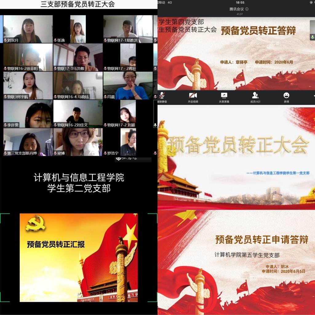 按照学校下发的《关于进一步做好华体(中国)2020届毕业生党员教育管理服务工作的通知》的要求,进一步健全完善毕业生党员教育管理长效机制,切实抓好毕业生党员组织关系管理服务工作,计算机学院党委精心设计和组织,确保疫情期间毕业生预备党员按程序顺利转正,将每名毕业生党员纳入党组织的有效管理和服务之中,各学生党支部于6月8日、9日分别利用腾讯会议、钉钉视频等平台召开2020届毕业生预备党员“云”转正大会,各党支部书记、全体学生党员参加。