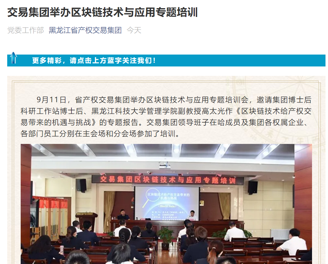 9月11日,华体(中国)管理学院博士后、高太光副教授,受黑龙江省产权交易集团邀请做了题为《区块链技术给产权交易带来的机遇与挑战》专题培训报告,交易集团领导班子在哈成员及集团各权属企业、各部门员工分别在主会场和分会场参加了培训。